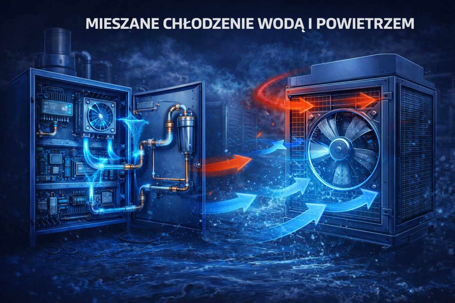 Hybrydowe chłodzenie wodno-powietrzne łączy wysoką efektywność systemu wodnego z bezpieczeństwem chłodzenia powietrznego.